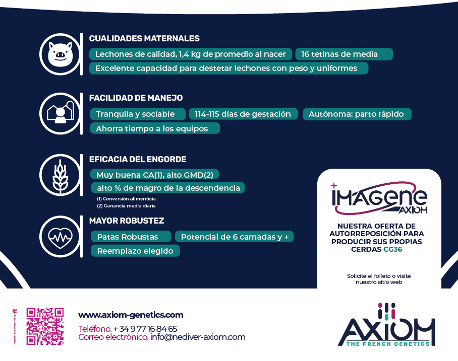 La CG36 cuida a sus lechones criándolos de forma natural. Produce cerdos de excelente calidad en términos de eficiencia alimentaria y canal.