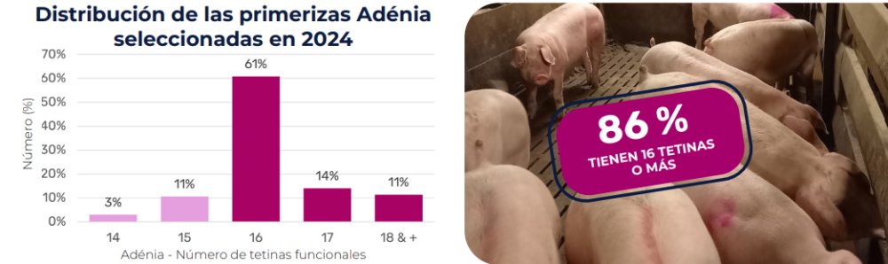 «Por su rendimiento, Sarl de Kerbelay vende muchos verracos Landrace a los centros de inseminación y muchas primerizas Landrace y Adénia a productores en el mercado frances e internacional. En la selección, prestamos mucha atención a la homogeneidad, la robustez de las patas y el número y la calidad de las tetinas. En la granja de selección, 53% de las cerdas Landrace tienen 16 tetinas y el 47% tienen 17 tetinas o más, y la calidad de la mama se mantiene muy bien a lo largo de toda su vida productiva. En cuanto a las Adénia, 86% tienen 16 tetinas o más (media de 16,2 desde el inicio de 2024), lo que representa una gran ventaja para destetar el máximo número de lechones bajo la madre. Por último, lo más destacable de esta granja de selección y multiplicación son sus resultados de GMD y IC en el engorde, a pesar de ser únicamente producción de líneas hembra (Landrace y Adénia), se situa al mismo nivel que la media de las granjas de producción.