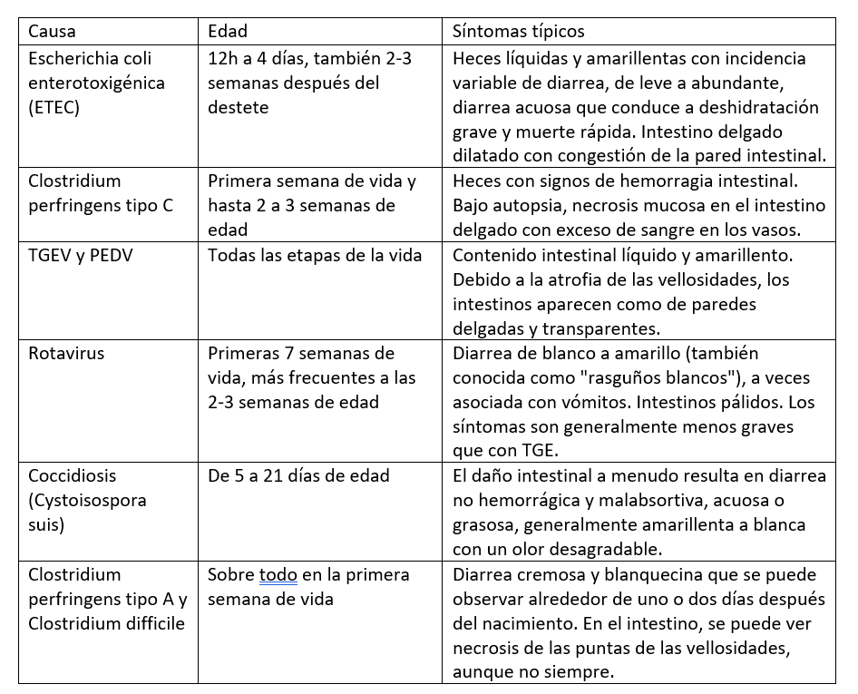 La siguiente tabla resume las causas infecciosas más importantes de la diarrea porcina neonatal, la edad típica en que los cerdos se ven afectados y los síntomas típicos.
