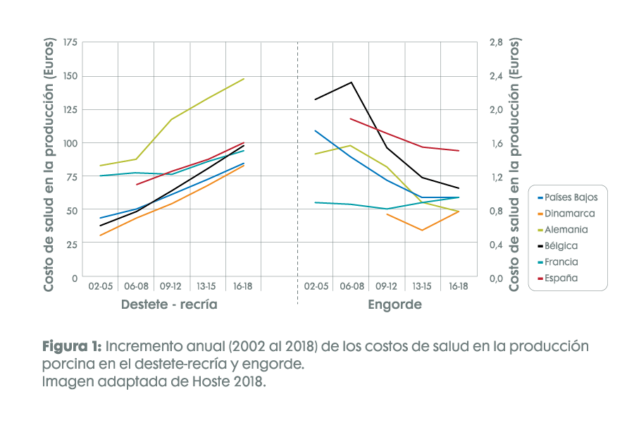El costo de producción y alimentación en la industria porcina no es similar en todas las etapas de producción. De hecho, cuando analizamos la distribución de los costos de producción en las fases iniciales el costo de producción en términos de salud y costos de alimentación durante la última década observamos que el costo de producción de los lechones en crecimiento es superior al de los cerdos de engorde (Data Europa), como puede observase en la Figura 1.
