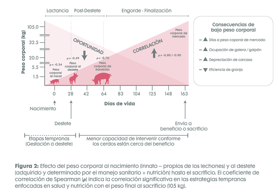 Esto no necesariamente significa que criar lechones es costoso, sino que los requerimientos sanitarios (vacunación + uso de antibióticos) y nutricionales (mayor requerimiento de amino ácidos + una alta digestibilidad de materias primas) son superiores en las fases iniciales versus las fases de engorde. Por otro lado, esto también nos indica que una inversión adecuada en las etapas iniciales tiene un efecto importante en la reducción de los costos totales de producción al incrementar la productividad del engorde. Blavi y colaboradores (2021) reportaron que existe una correlación significativa (Spearman) en las estrategias tempranas enfocadas en salud y nutrición con el peso final de los cerdos al sacrificio (aproximadamente 105 kg), Figura 2.