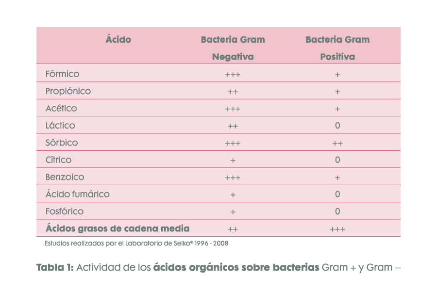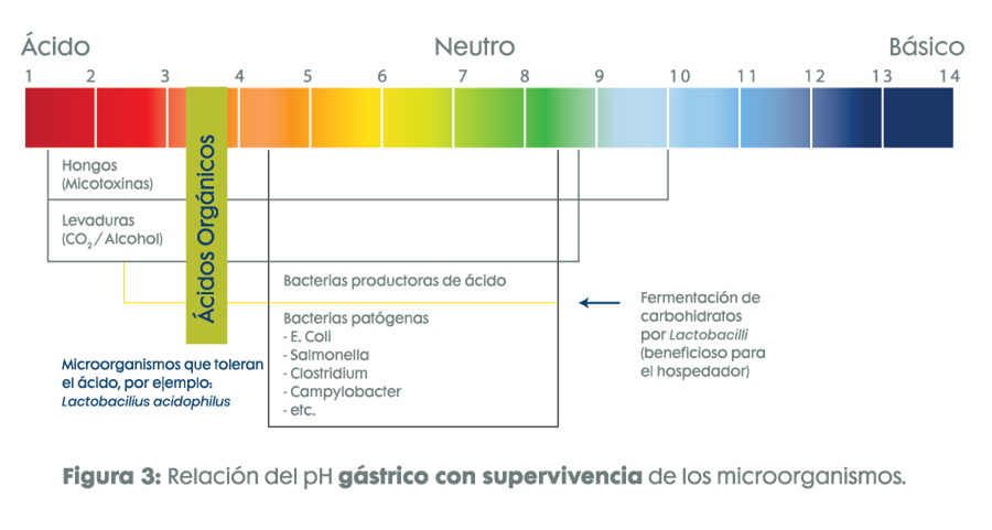 Dentro del abanico de posibilidad disponible para promover la salud gástrica, los ácidos orgánicos se han posicionado como la alternativa más efectiva y rentable a nivel mundial al promover el desarrollo de bacterias beneficiosas como los Lactobacilus y limitar el crecimiento de agentes patógenos como los coliformes (Kiarie et al., 2011; Kiarie et al., 2013), Tabla 1 y Figura 3. La efectividad de los ácidos orgánicos es incrementada al actuar en conjunción con los ácidos grasos de cadena corta y medias (MCFA + SCFA), lo que les permite incrementar su acción bactericida y actuar sobre una mayor población bacteriana.