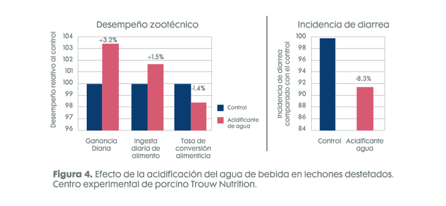 Estudios en condiciones comerciales por parte del centro de investigaciones porcinas de Trouw Nutrition han demostrado que acidificar el agua de bebida en los cerdos destetados tiene un efecto positivo sobre la productividad y prevalencia de la diarrea post destete. Ácidos orgánicos: dosis (2 ltr/1000) desde día 23 de vida al destete hasta día 51 (4 semanas), Figura 4.
