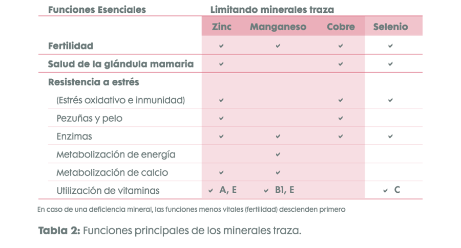 Los micro minerales o minerales traza como el Cu, Zn, Se, I y Mn cumplen funciones biológicas del crecimiento, reproducción y funcionabilidad del sistema inmunológico (Menegat et al., 2019), Tabla 2. Sin embargo, en dosificaciones superiores al valor nutricional-fisiológico estos también pueden contribuir como promotores del crecimiento.