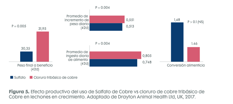 Uno de los minerales con mayor potencial en la nutrición porcina es el Cu. Valores de inclusión en formulación de entre 125 y 250 ppm se han utilizado en las dietas de cerdos para mejorar consistencia fecal en lechones de destete y mejorar el crecimiento desempeño tanto en destete como en cerdos de crecimiento y engorde (Bikker et al., 2016; Coble et al., 2017). La fuente más utilizada de Cu es el sulfato de cobre (CuSO4) (Cromwell et al., 1998). Sin embargo, el Cu en forma de cloruro de cobre tribásico (TBCC - Intellibond C) ha reportado un mayor potencial y efectividad para mejorar los índices productivos de los cerdos en crecimiento y engorde (Cromwell et al., 1998; Coble et al.,2017), Figura 5.