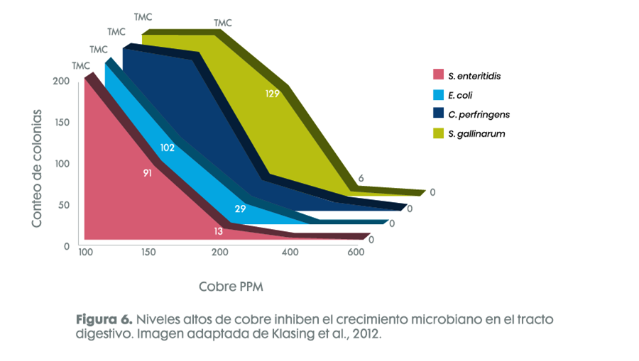 De manera similar al potencial de los ácidos orgánicos de regular la microbiota, el cloruro de cobre tribásico de Cobre en dosis promotora del crecimiento reduce el número de unidades formadoras de colonias en el tracto digestivo en base a pruebas in vitro, Figura 6.