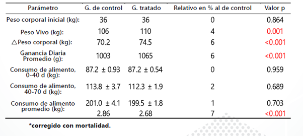 La prueba se llevó a cabo con 96 cerdos de engorde y dos tratamientos (grupo de control y grupo tratado con 1 kg/t Dysantic®), con 72 cerdos en el grupo tratado y 24 en grupo de control. La prueba tuvo una duración de 70 días. Se midió peso vivo al inicio y final de la prueba, la ganancia diaria de peso y la Conversión Alimenticia se calcularon al final de la misma.