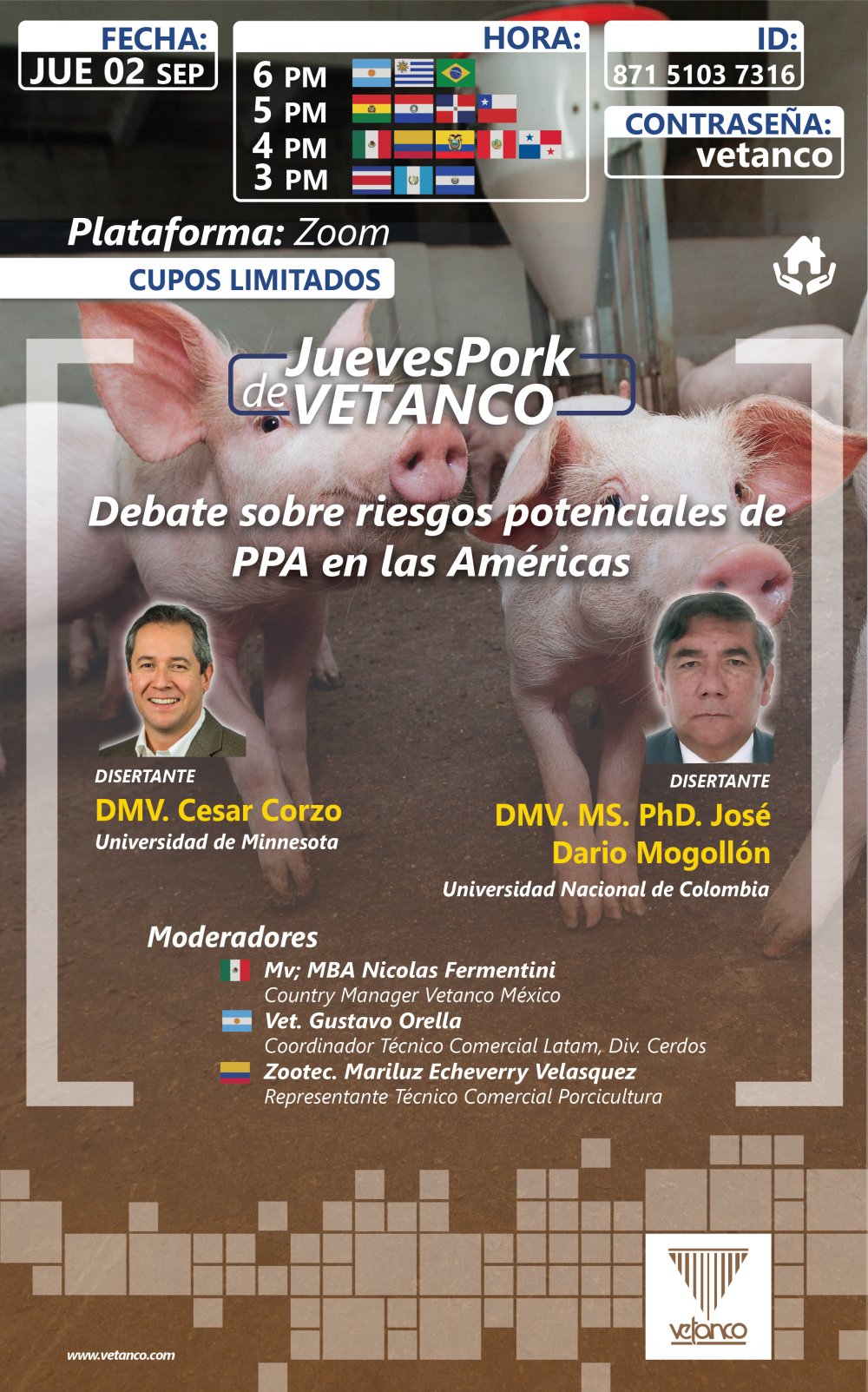 Los disertantes que abordarán estas temáticas serán César Corzo, de la Universidad de Minnesota (USA) y José Darío Mogollón, de la Universidad Nacional de Colombia. La agenda consiste en 40 minutos de disertaciones y 10 minutos para un espacio de ronda de preguntas por parte de los asistentes a este nuevo encuentro virtual de los Jueves Pork de Vetanco.