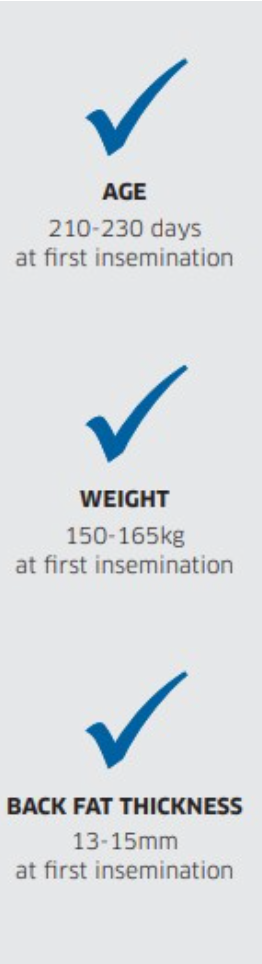 Antes del primer servicio, tres parámetros son determinantes: edad, peso vivo y espesor de grasa dorsal (P2). Con un programa de crecimiento y alimentación correcto, es posible obtener reposiciones uniformes, robustas y con el máximo potencial reproductivo.