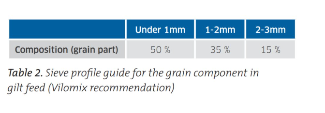 Las fibras solubles e insolubles son esenciales para el desarrollo y mantenimiento de una microbiota intestinal estable y para reducir el riesgo de úlceras gástricas, que afectan consumo, productividad y longevidad. Entre las fuentes recomendadas destacan pulpa de remolacha, alfalfa peletizada, avena, salvado de trigo y cascarilla de soja; como cereal base, la cebada es la opción preferente. Para una buena funcionalidad digestiva, Vilomix recomienda un grado de molienda semigrueso (figura 3).