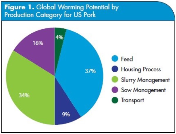Imagen 1. Principales potenciales contribuyentes para el calentamiento global (GWP) en la industria Porcina de Estados Unidos (The Environmental Benefits, 2013). Se puede apreciar que los aspectos que más contribuyen a la generación de gases contaminantes, son la alimentación de los cerdos (37%) y el manejo de purines (34%).