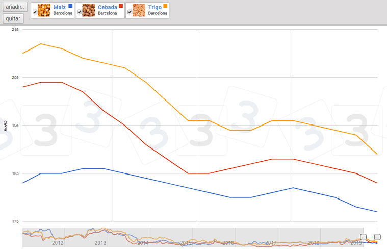 Il mais si attesta a € 168 / t (-3 € rispetto a marzo e rompendo la barriera psicologica di € 170 / t) per quello disponibile nel porto di Tarragona (Spagna), mentre il frumento è intorno ai € 195 / t. (-3 euro e € 27 / t di differenziale con mais) e l'orzo arrivo Lleida (Spagna) a circa € 178 / t (-6 €, rompendo la barriera psicologica di € 180 / ton e 1 euro sopra il mais arrivo Lleida). Il sorgo è di circa € 175 / t per quello disponibile nel porto di Tarragona, Spagna (-5 €, con un differenziale con mais di € 7 / t).