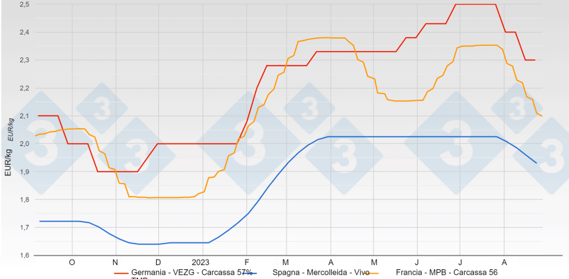 - In Francia (tradizionalmente il principale cliente della Spagna) i suini sono scesi da 2,35 €/kg carcassa a 2,05; l'enorme cifra di 0,30 €/kg di carcassa equivalente a 0,23 €/kg a peso vivo.