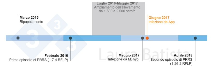Le future scrofette da rimonta, circa lotti di 60 scrofette ogni 3 settimane, venivano trasferite dal capannone di rimonta interno, mentre il resto dei suinetti veniva trasportato ogni settimana ai siti 2 e 3 esterni dello stesso sistema di produzione. Undici mesi dopo aver riempito l'allevamento, questo si è infettato col virus PRRS ceppo 1-7-4 RFLP. L'allevamento è stato stabilizzato con una singola inoculazione di virus vivo omologo a tutti gli animali riproduttori e da rimonta. Cinque mesi dopo, a causa della maggiore capacità dell'allevamento, il censimento è stato aumentato con animali da rimonta interni fino a un totale di 2.500 scrofe. Questa iniziativa ha comportato una distribuzione della parità (N° di parto) a "sinistra" (con un censimento più giovane) e di conseguenza le scrofette da rimonta interna avevano un'immunità meno robusta.