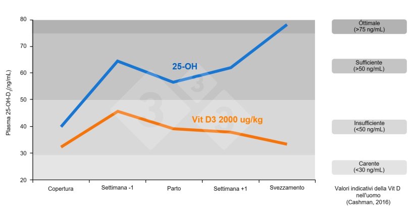 Pertanto, garantire la disponibilità di calcio attraverso adeguate concentrazioni plasmatiche di 25(OH)D3 ha un impatto enorme sulle prestazioni riproduttive.