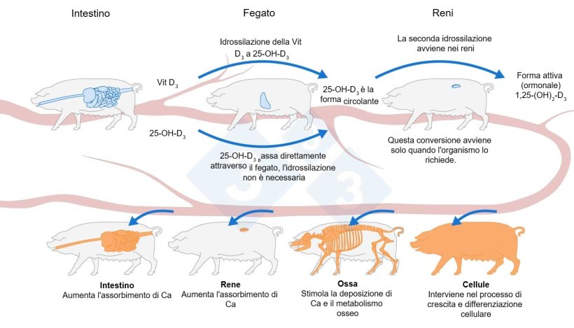 La vitamina D migliora la biodisponibilità e la digeribilità di calcio e fosforo partecipando al metabolismo di entrambi i minerali. Viene sintetizzata attraverso la luce solare (non disponibile negli animali allevati) e deve essere assunta tramite la dieta (integratori vitaminici). La forma più comune di vitamina D3 è quella assunta per via orale, che, dopo l'ingestione e l'assorbimento, viene idrolizzata nel fegato, entrando nel flusso sanguigno come metabolita circolante 25(OH)D3 (Figura 3).