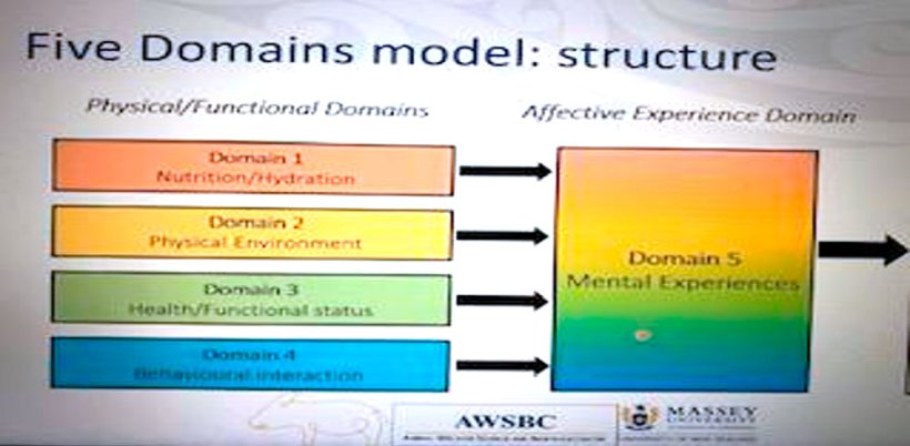 Il quinto dominio non è separato dagli altri quattro, poiché lo stato fisico e le interazioni comportamentali danno origine a esperienze mentali. Il dominio 1 include l'alimentazione e l'idratazione, 2 l'ambiente fisico, 3 lo stato di salute e funzionale e 4 interazioni comportamentali, tutte collegate al dominio 5 delle esperienze mentali sia positive che negative.