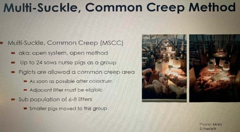 Negli ultimi 20 anni, i parametri produttivi sono notevolmente migliorati, sia nella dimensione della figliata che nell'efficienza alimentare. I programmi di gestione in sala parto sono fondamentali per ottenere la massima sopravvivenza dei suinetti allo svezzamento, poiché abbiamo riscontrato grandi differenze tra gli allevamenti sia nelle percentuali di mortalità che nei giorni in cui si verificano. Un nuovo paradigma si basa sulla semplificazione delle attività, sul miglioramento della sopravvivenza, sull'omogeneizzazione, sulla gestione del mangime iniziale e sullo svezzamento multiplo in gruppi (Multi-suckle, common creep Method, MSCC) - tutti i suinetti insieme di 24 scrofe. In questo sistema MSCC i vantaggi rispetto alle figliate singole stanno nell'avere più lampade termiche e mangiatoie in linea, con spazi aperti dovuti alla rimozione delle divisorie laterali, anteriori e posteriori. Riescono a ridurre la mortalità in lattazione e ad aumentare il peso allo svezzamento. In uno studio controllato in cui c'era un quadro di PRRSv, non hanno differenze importanti nella crescita e nella mortalità nei suini, ma ci sono differenze significative nel tasso di mortalità e prevalenza contro M hyorhinis, Streptococcus suis e influenza (maggiore nel controllo rispetto a in MSCC). , a causa della minore omogeneizzazione dell'esposizione e della minore socializzazione. Concludono che sono necessari ulteriori studi affinché questo sistema possa essere implementato nella pratica degli allevamenti, affrontando l'uso dei posti parto, l'età dello svezzamento, le adozioni-trasferimenti e l'atteggiamento del personale dell'allevamento.