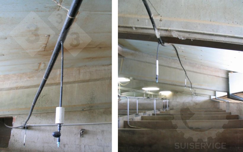 Il sistema più diffuso consiste nell’installare una linea d’acqua in materiale plastico che scorre appesa al soffitto, alla quale, in corrispondenza di ogni box viene agganciato uno spruzzatore (ne esistono di vari tipi).