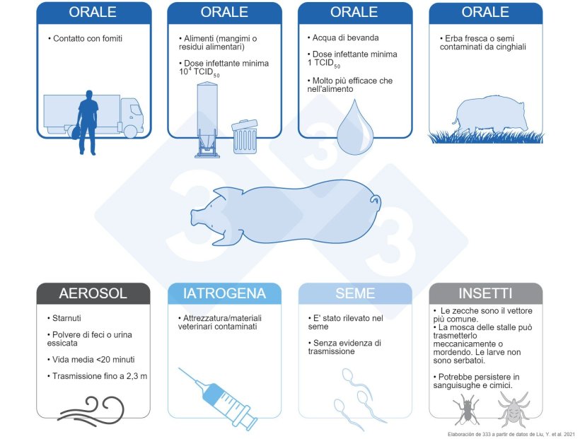Erba fresca e semi contaminati da cinghiali infetti sono potenziali fonti di infezione per i suini allevati all'aperto ad uso familiare (Guinat et al. 2016).