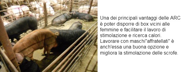 Una seconda questione necessaria rimane l'opzione di avere una area ricerca calori (ARC) o zona specifica dove concentrare il lavoro di stimolazione e venuta in calore, dove si posizionano i verri per la ricerca e una volta inseminate le scrofe, si possono spostare alle gabbie per il controllo gravidanza. Un'altra scelta sarebbe svezzare e inseminare in gabbia dove le scrofe rimarranno fino al 28° giorno di gravidanza.
