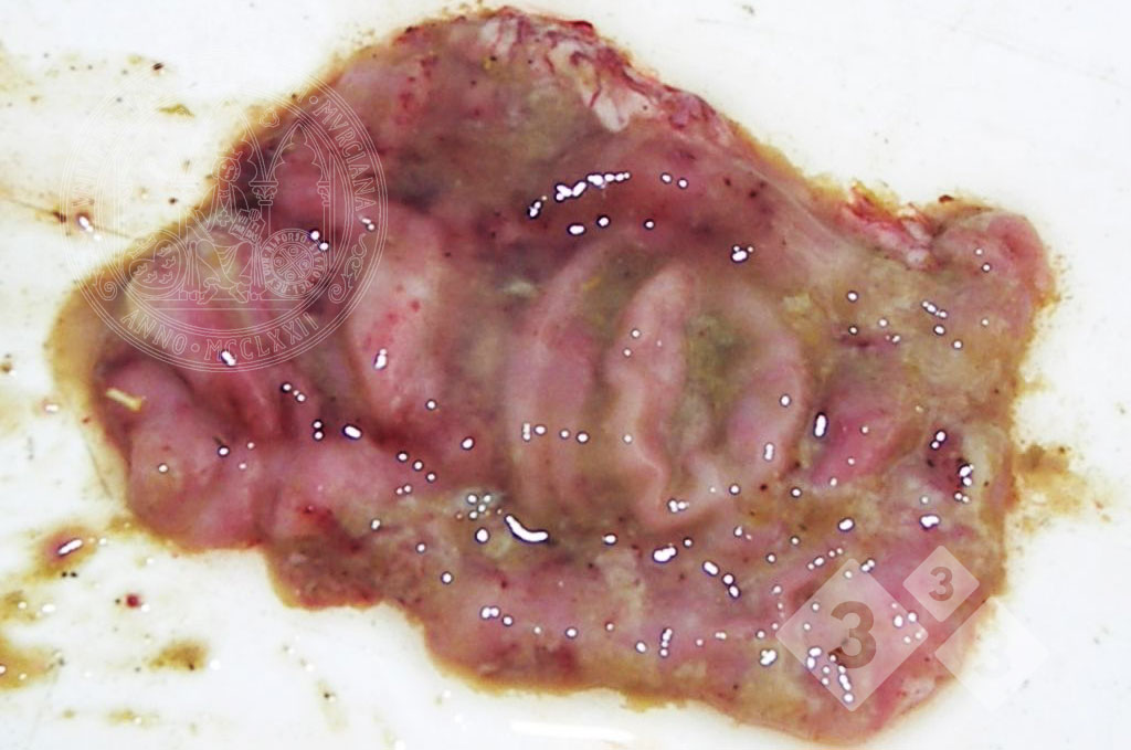 Porzione del colon di un suino iberico da ingrasso in cui la mucosa appare ispessita e su di essa compaiono resti di muco e sangue. È una colite muco-emorragica prodotta dall'infezione da Brachyspira hyodysenteriae. Lesioni molto simili possono essere causate da B. pilosicoli. In entrambi i casi, è interessato solo l'intestino crasso.