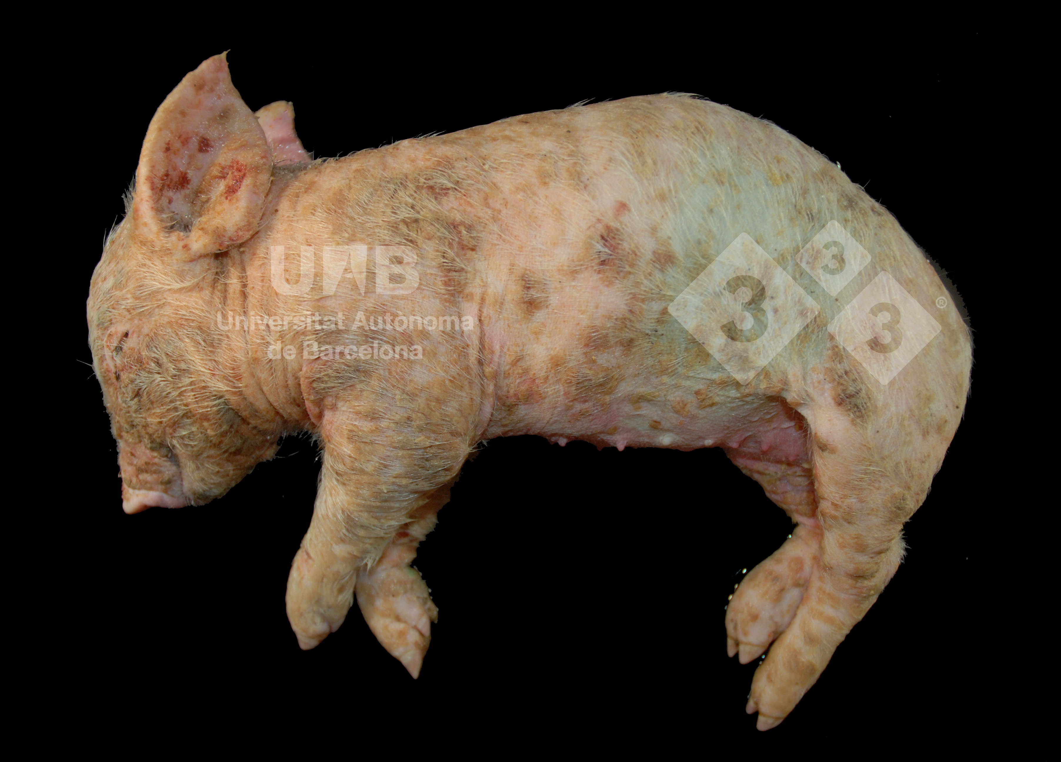 Questo suinetto aveva 7 giorni. La distribuzione diffusa delle lesioni in tutto il corpo e l'età dell'animale sono altamente indicativi di epidermite essudativa, una malattia causata da Staphylococcus hyicus.