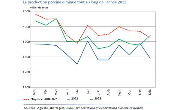 Nel 2023, la produzione suina francese è nuovamente diminuita, in linea con il declino del patrimonio suino. Il prezzo del suino è rimasto sopra i 2€/kg...