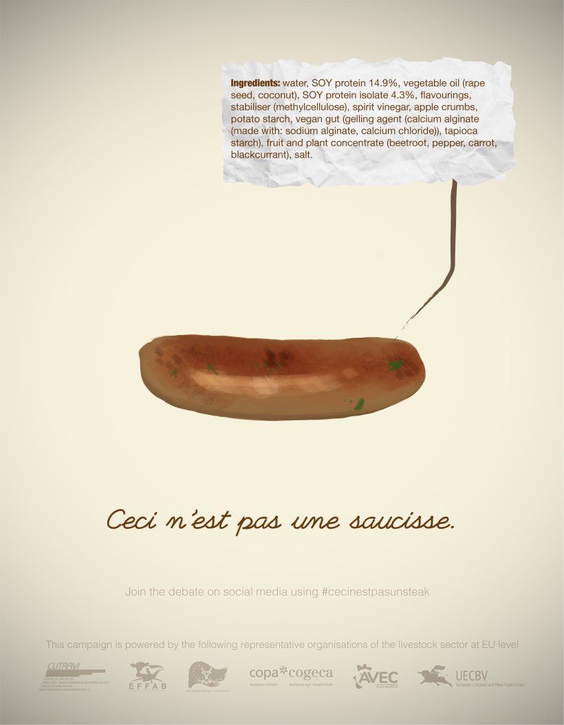La campagna di comunicazione "ceci n'est pas un steak" solleva interrogativi fondamentali sulle informazioni fornite ai consumatori, sul nostro patrimonio culturale e sul potere del marketing moderno, che mescola valori e grandi interessi commerciali senza farsi troppi problemi. Nel manifesto della campagna, le organizzazioni europee sottolineano il fatto che per quanto riguarda i prodotti vegani, si tende a dimenticare che gli agricoltori europei hanno interesse a produrre proteine sia vegetali che animali e non sono contrari alla produzione di proteine vegetali per prodotti vegani. Tuttavia, le imitazioni vegetali che tendono a copiare le denominazioni e le caratteristiche della carne e dei prodotti lattiero-caseari dovrebbero sviluppare un nuovo approccio. Il settore dei prodotti di origine vegetale dovrebbe essere più creativo. Invece di investire nelle attività di lobbying, queste aziende dovrebbero lavorare su nuovi concetti di marketing, per ottenere il riconoscimento dei consumatori e risolvere il paradosso fondamentale dell'industria delle imitazioni vegetali. Un'industria che si sforza di