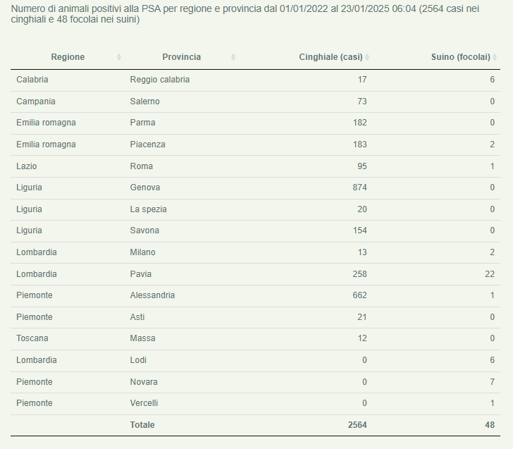 23-Gen-2025 (1 anni 2 mesi 27 giorni fa)Dopo quasi 3 anni dai primi casi nell’aprile 2022 la peste suina africana è stata eradicata nella zona di Roma. Il PAFF COMMITEE ha votato per la revoca alle restrizioni in Provincia. La mappa d'Italia si alleggerisce....