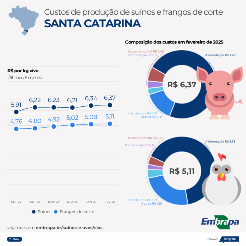 A Santa Catarina, il costo di produzione per chilo di suino vivo ha raggiunto i 6,37 R$, con un aumento dello 0,37% rispetto a gennaio. L'incremento cumulato negli ultimi 12 mesi è dell'11,82%, con l'ICPSuíno che ha raggiunto i 364,26 punti. I mangimi per animali si sono distinti come la principale componente di costo, con un aumento dello 0,10% nel mese e del 10,86% nel totale accumulato negli ultimi 12 mesi, raggiungendo una quota del 72,62% nel costo totale di produzione.