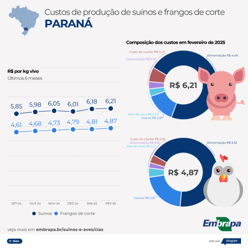 Secondo gli studi condotti da Embrapa Swine and Poultry attraverso il suo Poultry and Swine Intelligence Center, a febbraio 2025 il costo della produzione suina ha registrato un nuovo aumento nei principali stati produttori ed esportatori.