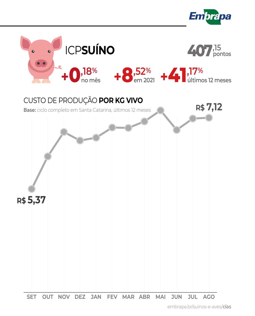 I costi di produzione del suino sono nuovamente aumentati nel mese di agosto, secondo gli studi pubblicati dal CIAS, Poultry and Pork Intelligence Center di Embrapa, che rende disponibili le informazioni sul sito web embrapa.br/suinos-e-aves/cias.