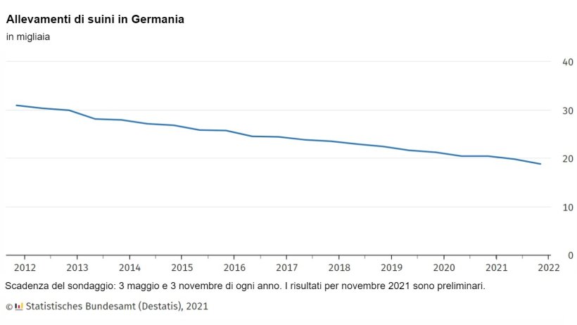 Secondo i dati preliminari dell'Ufficio federale di statistica (Destatis), al 3 novembre 2021 la mandria di suini in Germania era di 23,6 milioni di capi, il dato più basso registrato dal 1996. Rispetto ai dati del maggio 2021, il numero di suini è stato ridotto del 4,4% o 1.081.000 capi. Rispetto a novembre 2020 il numero è diminuito del 9,4% ovvero 2.450.300 capi.
