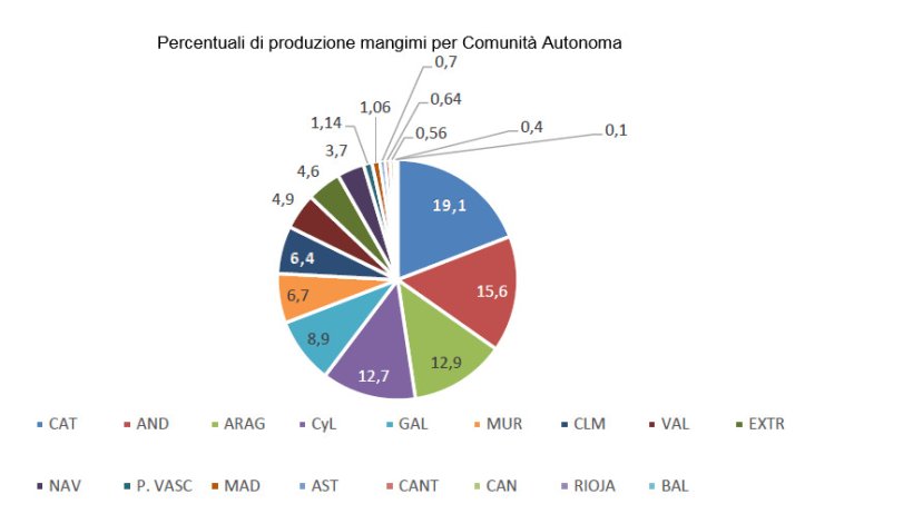 Secondo le stime della produzione di FEFAC per l'anno 2016, in un documento aggiornato a giugno 2017, la Spagna è stata il secondo più grande produttore di mangimi per animali nell'UE, con un aumento del 1,6% rispetto al 2015, dietro la Germania (diminuzione del 0,1% rispetto al 2015), con la Francia al terzo posto (in calo del 3,4% rispetto al 2015).