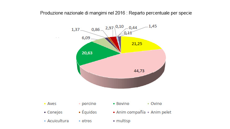 Per quanto riguarda il tipo di mangime, vale la pena menzionare la diminuzione della produzione di mangimi medicati sul totale dei mangimi prodotti, che nel 2015 è del 13,8% e diventa il 12,5% nel 2016. Il 13,5 del totale PM prodotto, corrisponde al mangime contenente antiparassitari non utilizzati come promotore della crescita. D'altra parte, la quantità di mangimi biologici prodotti nel 2016, rispetto all'alimentazione totale prodotta, è stata ridotta da quasi lo 0.11% allo 0.092%. Per specie di destinazione, l'avicoltura (42,4%), bovini (28,2%) e prodotti "multispecie" (18,3%) continuano ad essere evidenziati per questo gruppo di mangimi.
