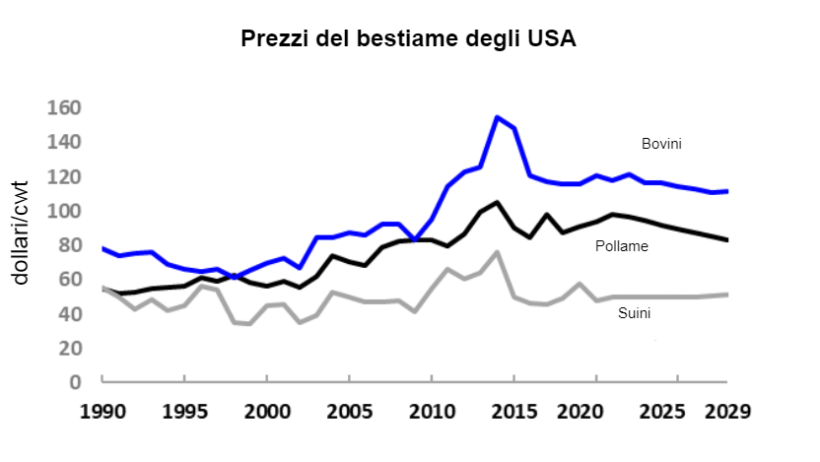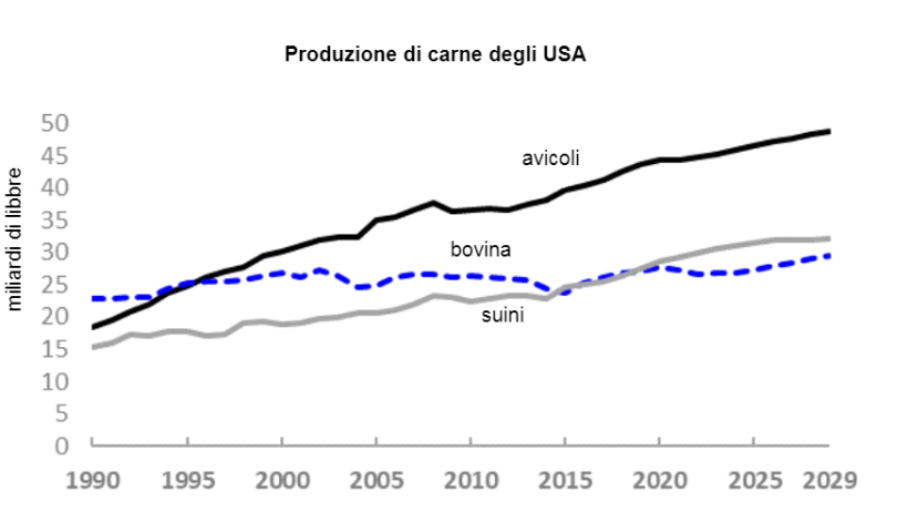 Mentre la produzione di carne suina e bovina è stata più o meno equivalente negli ultimi anni, si prevede che la produzione di carne suina supererà la produzione di quella bovina durante la maggior parte del periodo di proiezione, raggiungendo un massimo di 32,1 miliardi di libbre nel 2029, rispetto a 29,5 miliardi di libbre per vitello.