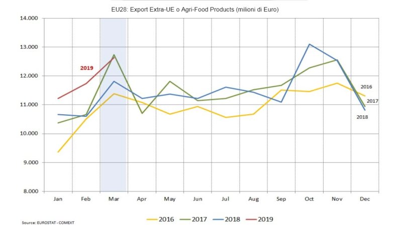 Il valore mensile delle esportazioni agroalimentari dell'UE nel marzo 2019 è stato pari al livello record di marzo 2017, raggiungendo 12.600 milioni di euro, il 7,0% in più rispetto al livello di marzo 2018. Le importazioni nel mese di marzo hanno raggiunto 10.100 milioni di euro, l'1,9% in più rispetto a marzo 2018. Pertanto, l'avanzo commerciale mensile agroalimentare si è attestato a 2.500 milioni di euro, con un incremento di oltre il 34% rispetto al saldo commerciale positivo di 1.900 milioni di euro nel marzo 2018.