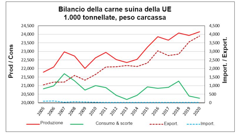 Mentre la produzione europea di suini si sta espandendo, il consumo interno diminuisce di circa 20,8 milioni di tonnellate (equivalente peso carcassa). Il consumo diminuisce leggermente nella maggior parte dei paesi, ma significativamente in Germania. Il consumo interno totale dovrebbe scendere a circa 20,3 milioni di tonnellate nel 2020, lasciando 3,9 milioni di tonnellate disponibili per l'esportazione. Nel 2020, il 16,1% della produzione nazionale dovrebbe essere esportato verso paesi terzi, con la Cina come destinazione principale per gli esportatori di carne suina dell'UE.