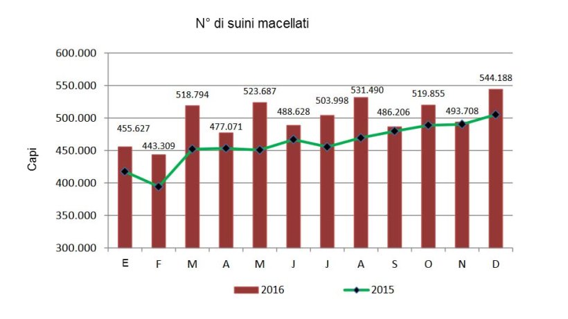 Secondo i dati del Boletín Porcino pubblicato dal Ministerio de Agroindustria, durante il 2016 sono stati macellati 5.986.561 capi, che significa un aumento del 8,38% rispetto al 2015 (5.523.715 capi).