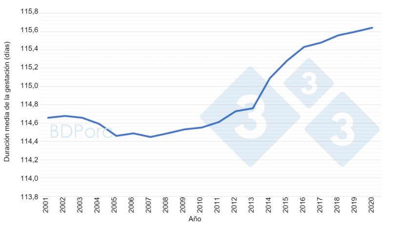 Quisimos comparar estas respuestas con la información recopilada durante los últimos veinte años por la base de datos BDporc y vimos que la duración media de la gestación observada en las cerdas está aumentando en España, pasando de 114,6 en 2001 a 115,6 en 2020 (Gráfica 2).