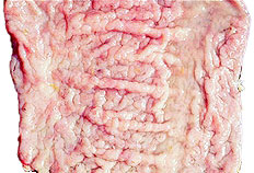 Una vez abierto el intestino, la mucosa está húmeda y sin mucus y en ella son claramente visibles pliegues profundos longitudinales y transversales que le dan un gran grosor (figs. 6 y 7).