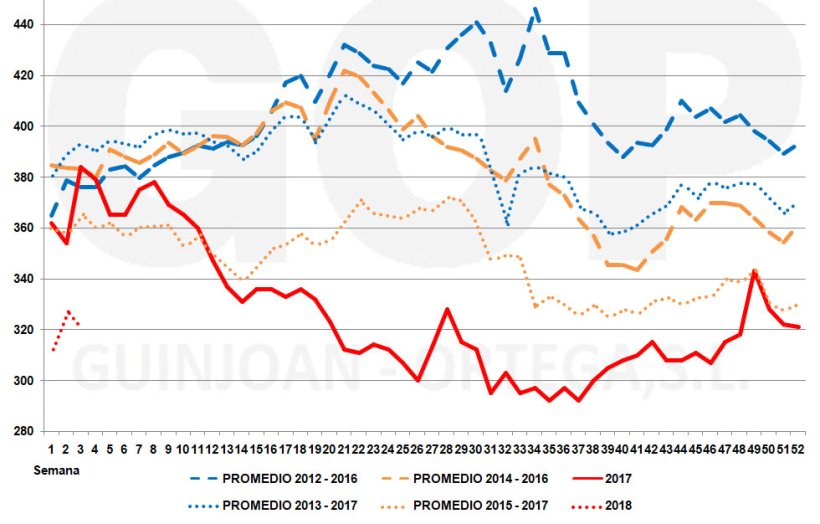 Quizás deberíamos pensar que sería interesante tomar la decisión de asegurarnos el precio para los próximos 2-3 meses y esperar a tener las cifras finales de cosechas y estocs de Sudamérica para decidir las compras del segundo semestre. Estacionalmente los precios tienden a bajar de manera significativa a partir de las semanas 26-27.