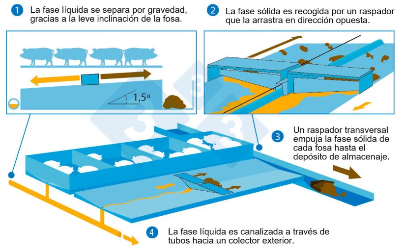 Debido al desnivel, de aproximadamente el 1,5%, y por acción de la gravedad, la parte líquida se desplaza hacia una punta de la fosa y es canalizada a través de tubos hacia un colector exterior mientras que la parte sólida es arrastrada por los raspadores hasta la zona más alta de la fosa donde existe un raspador transversal que recoge esta parte sólida y la traslada hacia el exterior de la nave, donde se acumula hasta su posterior uso. Esta operación se realiza varias veces al día, permitiendo tener siempre las fosas libres de deyecciones.
