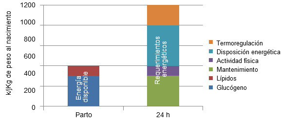 Figura 1: Disponibilidad de energía al nacimiento y requerimientos energéticos a las 24h de vida de un lechón.