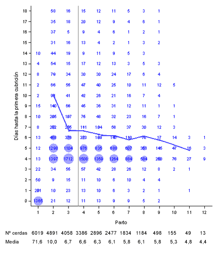 El intervalo destete-cubrición fértil se define como el intervalo hasta la cubrición fértil, es decir, la cubrición que da lugar a un parto. Es un parámetro más complejo que el anterior ya no sólo por su valor medio, sino sobre todo su distribución. Es un parámetro que además proporciona información indirecta sobre las pérdidas en gestación. Por lo tanto, es un valor más directamente relacionado con la productividad de la granja. De hecho, una granja puede tener un intervalo destete-primera cubrición bueno (si logra cubrir casi todas las cerdas 4-5 días después del destete) pero un intervalo destete-cubrición fértil malo (si tiene muchas pérdidas en gestación, es decir, si su fertilidad a parto no es buena). El rango para este parámetro es más variable, dependiendo de la tasa de partos de cada explotación. Para las mismas cerdas de la base de datos de PigCHAMP, este intervalo ascendió a 12,8 días, debido a las cerdas bien cubiertas en sus días correspondientes pero que por algún motivo perdieron la gestación. Siempre es de interés utilizar tablas de desglose para el análisis de este parámetro como el que se presenta en la tabla 1.