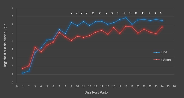 Figura 1. Ingesta diaria de alimento durante la estación fría y cálida. El consumo de alimento difirió entre estaciones del día 9-18 y del 20-24 (×; P <0,05). Se utilizaron un total de 17 y 31 cerdas para la estación fría y cálida respectivamente.