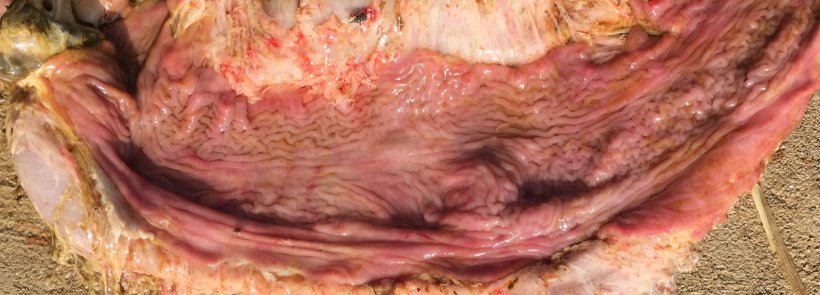 En un primer momento hubo la posibilidad de confusión del trastorno con un problema temprano de ileítis. Se usó tiamulina en el agua y pudimos corregir ciertas diarreas y bajas pero el problema continuaba. Se planteó dicha posibilidad porque en algunas necropsias se podían encontrar signos de una enteritis proliferativa provocada por Lawsonia intracellularis, ya que las tiflocolitis fibrinosas y catarrales de algunos animales eran muy llamativas (figura 2A, figura 2B).