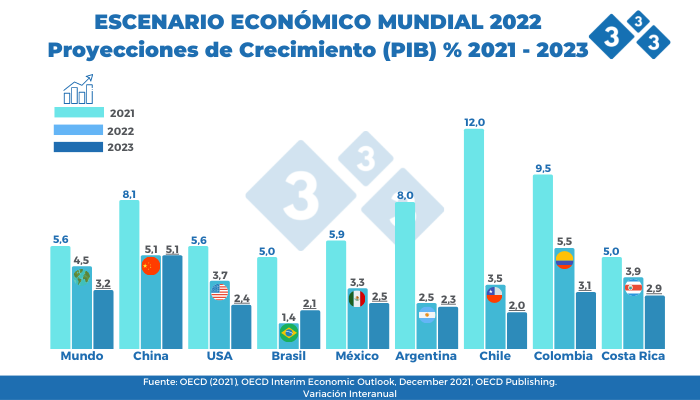 De acuerdo con las últimas proyecciones económicas publicadas por la Organización para la Cooperación y el Desarrollo Económicos (OCDE), el año 2021 representó el despegue de las economías, luego de las restricciones impuestas por la pandemia, lo cual, se refleja en los elevados crecimientos del Producto Interno Bruto (PIB) en la mayoría de los países (Gráfico 1).