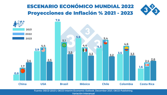 Es así como para Estados Unidos, se proyecta una inflación de 3.9% al finalizar este año. Por su parte, Brasil ostentaría la mayor inflación de Latinoamérica con un 7.8%, seguido por México (5.6%) y Chile (4.3%) (Gráfico 2).